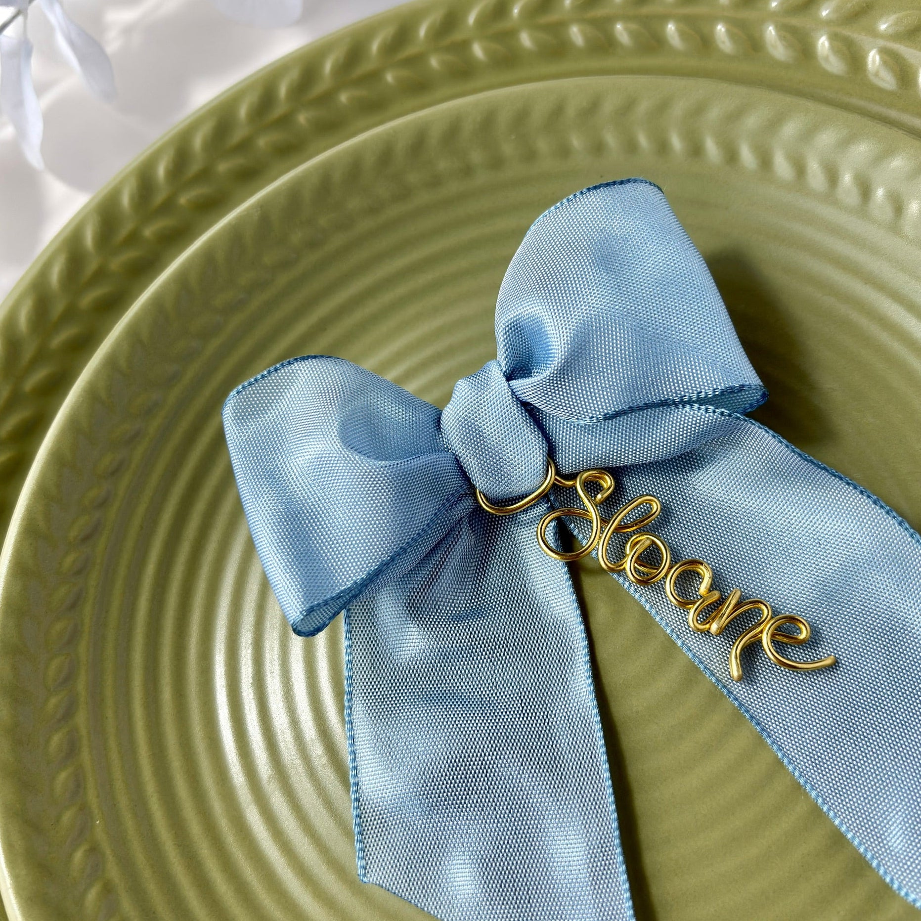 These charms combine a soft, hand-tied fabric bow with a custom wire name to help you pull your wedding look together. Whether you tie them around a glass for a morning toast with your bridesmaids, or lay them flat on a napkin as a personalised place setting, they add a thoughtful, finished feel to your aesthetic.