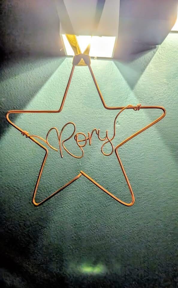 Add a touch of sparkle to your Christmas tree with this personalised wire star bauble, handmade to order in my Lincolnshire studio. This custom name star ornament makes a beautiful Christmas gift/stocking filler for children, babies, new parents, teachers, etc. Each bauble is carefully shaped by hand from high-quality aluminium wire, creating a timeless star outline with your chosen name featured across the centre.